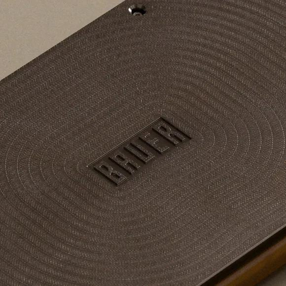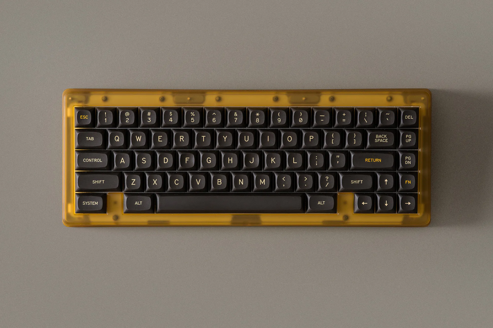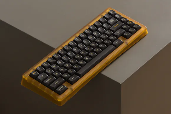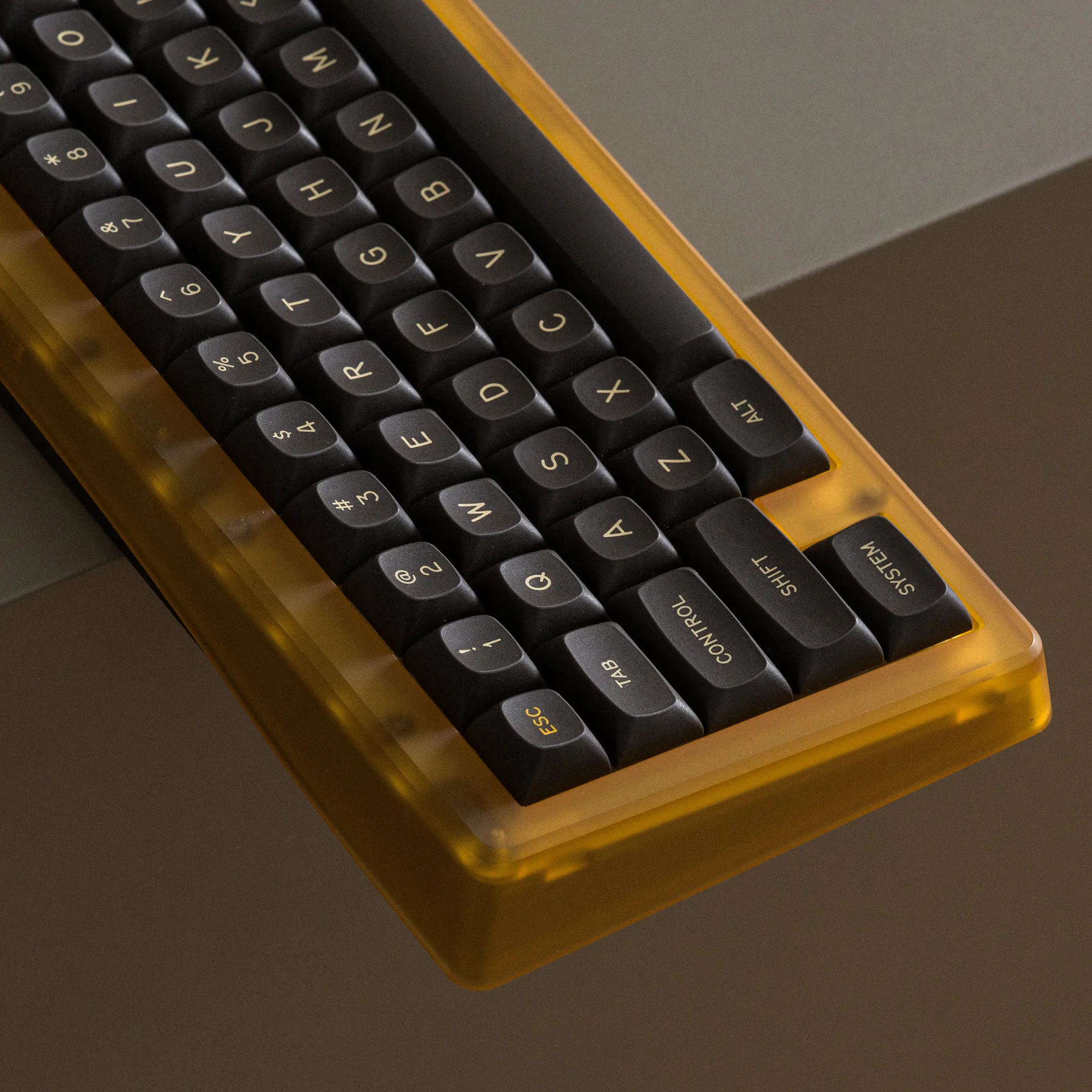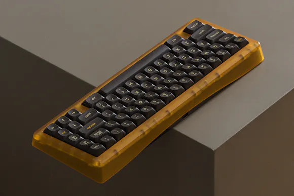 Before the group buy opens, we're running a raffle for this limited colorway that won't be part of the main offering: an amber PC top paired with an aluminum bottom that's anodized dark gray and left with the machine marks fully exposed on the exterior, concentric rings centered around the Bauer logo. No attempt to hide how it was made.
